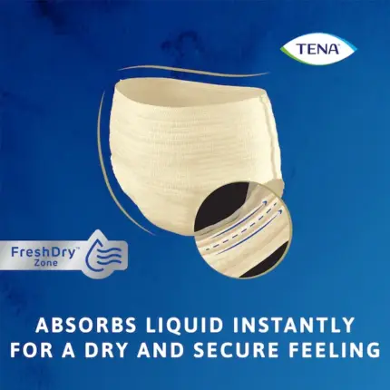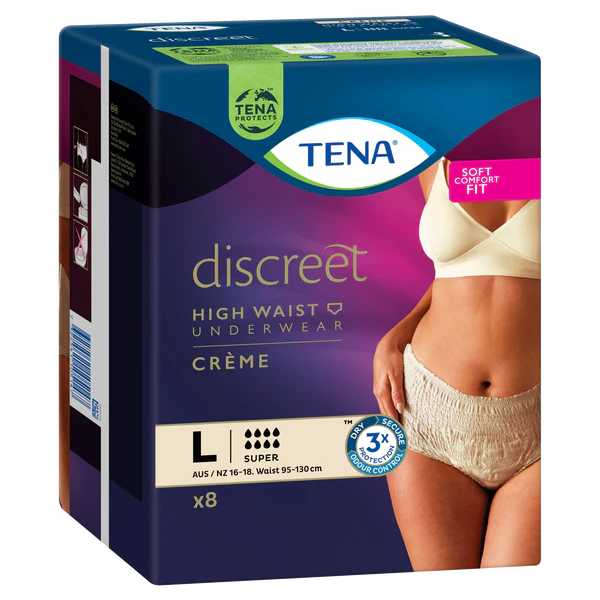 TENA Discreet Plus High Waist Crème offers a chic creme design both inside and out, featuring a stylish high, lingerie waistline to match your personal taste. Experience reliable protection against moderate to heavy bladder weakness, without sacrificing elegance with this sophisticated disposable underwear design.