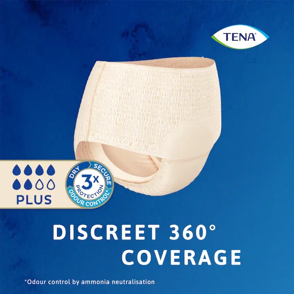 TENA Discreet Plus High Waist Crème offers a chic creme design both inside and out, featuring a stylish high, lingerie waistline to match your personal taste. Experience reliable protection against moderate to heavy bladder weakness, without sacrificing elegance with this sophisticated disposable underwear design.